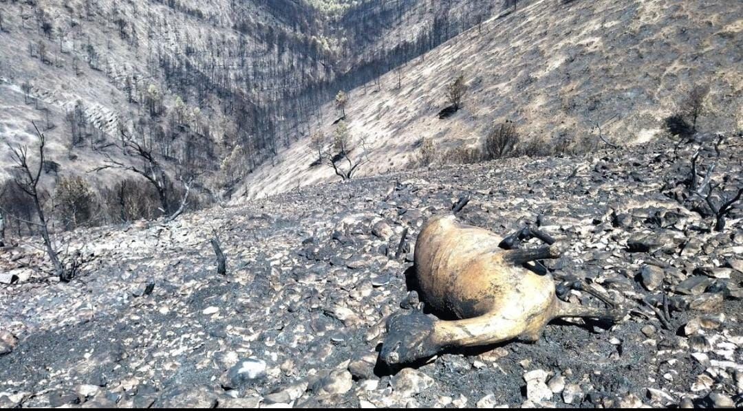 Pero también perece la fauna que no puede huir, e incluso los que podrían hacerlo, como el ruido de los medios aéreos y la virulencia del fuego, ellos mismos se meten en las llamas y mueren. Esto debió ocurrir con los muflones del vallado cinegético de Alcalá, donde vimos varios muertos, incluso también algún arruí también murió víctima de las llamas.